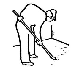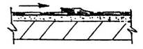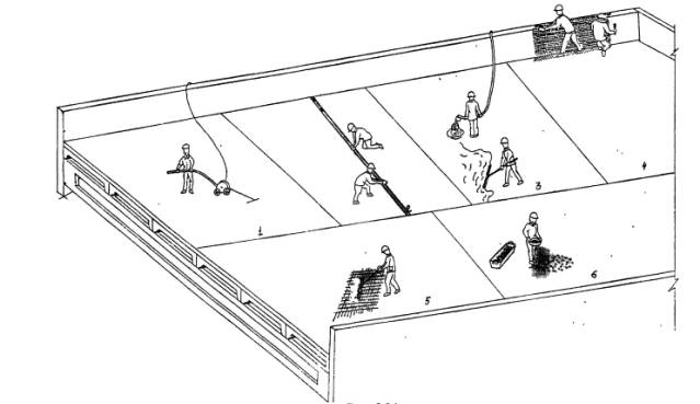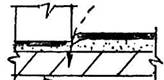 Основным механизмом, обеспечивающим дисперсное армирование стяжки, является пистолет-напылитель ЦНИИОМТП, нарезающий стекловолокно, поступающее из бобины, на отрезки 20-60 мм, разделяя при распылении на элементарные нити и равномерно распределяя в цементно-песчаном растворе. Цементные растворы в этом случае рационально использовать на основе расширяющихся гипсоглиноземистых или глиноземистых цементов с содержанием окиси кальция от 11 до 16 % по массе. Песок следует использовать кварцевый с модулем крупности не менее 2 и количеством глинистых частиц в песке не более 2 % по массе. В качестве пластифицирующих добавок рационально применять латексы синтетические СКС-65ГП марки "Б" или марки "К". Латексные добавки вводят в цементно-песчаный раствор из расчета 12-15 % от массы цемента. Для получения стяжки повышенной плотности рекомендуется фуриловый спирт, солянокислый анилин для его отверждения и хлористый кальций для ускорения твердения и полимеризации фурилового спирта. Для примера приведен состав раствора (в кг): - глиноземистый или гипсоглиноземистый цемент -1500; - фуриловый спирт - 36; - солянокислый анилин - 9; - хлористый кальций -15; -вода-540. 3.7. В цементно-песчаной стяжке основания допустимы трещины шириной до 0,3 мм, при большей ширине трещины в основании следует ремонтировать. 3.8. В сохранившейся стяжке трещины, выбоины и каверны уплотняют цементным раствором или полимерраствором; им же выполняют и выкружку в примыканиях к выступающим над крышей конструкциям (элементам). Выкружки следует выполнять из цементно-песчаного раствора на напрягающем цементе НЦ-20(40) или из полимерраствора (см. п. 1.15) с таким расчетом, чтобы переход от горизонтали к вертикали имел наклон около 45° шириной около 750 мм. При обнаружении пустот (каверн) в зоне сопряжения вертикальных поверхностей (стены, парапеты, шахты) их обязательно расчистить и уплотнить вышеуказанными растворами. 3.9. Металлические окрытия "фартуки" снимают (при выполнении кровли из мастик Абрис Ру и БСКМ окрытия не требуются), а "выдры" оштукатуривают полимерраствором (см. п. 1.12). 3.10. Скопившуюся на кровле воду удаляют, используя машины типа СО-222 или СО-160А (рис. 3.2), работающие по принципу вакуумного отсоса. 3.11. Для подсушки изолируемой поверхности рационально использовать горелки (рис. 3.3, 3.4). При незначительных объемах работ по подсушке поверхностей (отдельные "блюдца") можно пользоваться инжекционной горелкой (см. рис. 3.4). 3.12. Счистку наплывов мастики и нарезанных на полосы полотнищ рулонного "ковра" выполняют стальным скребком (рис. 3.5). 3.13. Обеспыливание старой стяжки выполняют с помощью струи сжатого воздуха от компрессора, оборудованного маслоотделителем. 3.14. Зачистку выступающих над крышей металлоконструкций и ограждений, а также расчистку старых швов в кровельных панелях рационально выполнять, используя реверсивную пневмощетку со сменными насадками (см. рис. 2.11). 3.15. Зачастую, при снятии старого кровельного покрытия, приходится счищать и стяжку, выполняя ее заново, при этом целесообразно подавать цементно-песчаный раствор растворонасосом, укладывая стяжку полосами шириной 2 м и длиной 6 м, заполняя их раствором через одну (рис. 3.6). После схватывания раствора, заполняют пропущенные полосы, при этом края готовых полос служат маяками, а начальные маяки-рейки (деревянные или металлические) об