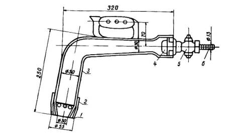Конструктивная схема горелки ПКБ ЛНИИ АКХ: 1 - тележка, 2 - планка контрольной горелки, 3 - планка боковой горелки 4 - тяга центральная, 5 - тяга левая, 6 - тяга правая, 7 - газовая горелка ГИНВ-1, 8 - шланг