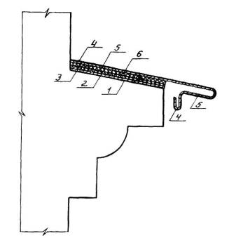 Конструктивная схема герметичного крепления окрытия выступающих фасадных элементов самоклеящейся лентой Абрис®: 1 - зона очистки поверхности, 2 - слой Лукара-ОП или ХСПЭ, укрепляющий скрываемую поверхность, 3 - лента Абрис®С-ЛБ, 4 - - металлическое окрытие с отворотной лентой и слезником, 5 - - антикоррозионное покрытие Лукаром-5 или ХСПЭ лаком, 6 - лента Абрис®С-ЛБ, заблаговременно приклеенная к металлическому открытию