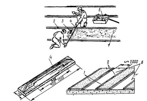 Схема устройства стяжки: 1 - цементно-песчаный раствор, 2 - рейка-ограничитель ширины полосы укладки раствора, 3 - укладываемый (выравниваемый) раствор, 4 - разравнивающая рейка - правило, 5 - емкость с раствором, 6 - зоны последующей укладки