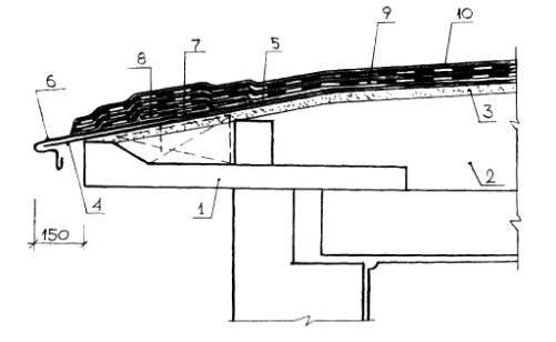 Конструктивное решение кровельного свеса скатной мягкой кровли: 1 - железобетонная карнизная плита, 2 - железобетонное перекрытие, 3 - стяжка, 4 - металлический костыль с антикоррозионным покрытием, например, Лукар-5, 5 - грунтовка разжиженной мастикой Абрис®Ру, 6 - слив-окрытие с отворотной лентой, 7 - слой мастики Абрис®Ру, 8 – дополнительные слои армирующей основы из нетканки или стеклосетки, 9 - армирующая основа из нетканки или стеклосетки, 10 - декоративно-защитное покрытие - мастика БСКМ с алюминиевой пудрой