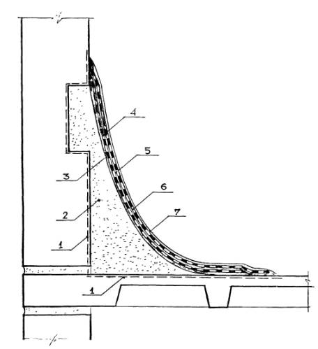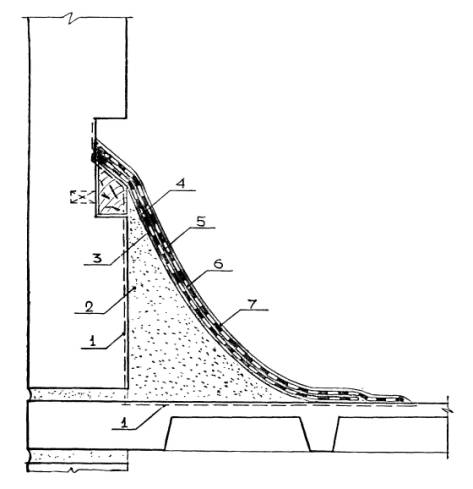 Рис. 5.3. Конструктивно-технологическое решение герметизации примыкания кровельного покрытия к стене с выдрой: 1 - зона очистки (пунктир), 2 - полимеррастворная выкружка, 3 - приклеивающий слой мастики Абри®Ру по грунтовке, 4 - тонкая ткань, 5 -приклеивающий слой мастики БСКМ, 6 - толстая ткань, 7 - защитно-декоративное покрытие БСКМ с алюминиевой пудрой