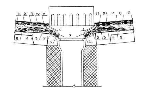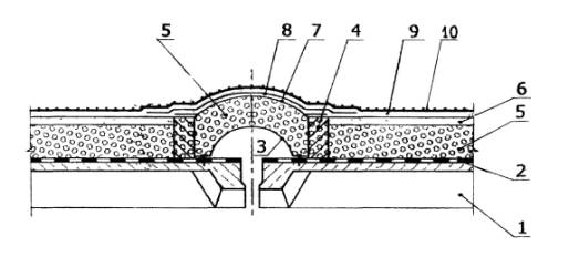 Рис. 5.46. Конструктивное решение деформационного шва покрытия: 1 - железобетонная плита покрытия; 2 - пароизоляция мастикой Абирс®Ру с покрытием стеклотканью; 3 - компенсатор (медь, латунь, дюраль, оцинкованная сталь - по 4 - армированный элемент-бортик из полистиролбетона; 5 - теплоизоляция - полистиролбетон (пенополиуретан, пенобетон); 6 - стяжка-разуклонка из цементно-песчаным раствора на 7 - компенсатор (оцинкованная сталь, медь, алюминий - согласно 8 - рулонный кровельный материал (по проекту); 9 - мастика БСКМ; 10 - декоративно-защитное покрытие