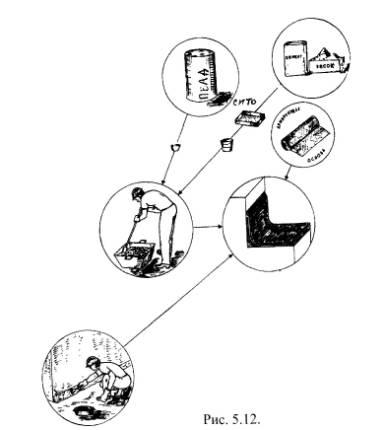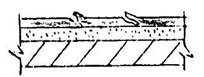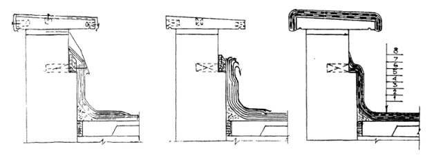 Для устройства "дышащей" кровли дополнительно используют рулонные битуминозные материалы в качестве первого нижнего слоя, приклеиваемого к основанию полосами, пятнами или точками из мастики Абрис®Ру, равномерно рассредоточенными по основанию и занимающими около 25 % ее площади. Рулонный материал укладывают встык. Поверх рулонного слоя укладывают обычным образом кровельный слой мастики БСКМ толщиной 1,5 ± 0,5 мм. При этом частичную приклейку к основанию следует доводить до краев кровли на всех наклонных и вертикальных участках. Верхний край кровли в этом случае следует защищать металлическим или пластиковым фартуком, герметично закрепленным к стене. 5.9. Рационально после нанесения первого мастичного слоя выполнить все узлы сопряжений и примыканий, заактировав эту работу. 5.10. Если по проекту принято решение армировать кровельное покрытие, то при нанесении первого слоя сразу же раскатывают по нему ткань или нетканое полотнище (рис. 5.4). На следующий день наносят второй слой мастики БСКМ. Если предусматривается усиленный вариант кровли, то до затвердевания второго слоя по нему раскатывают армировку (ткань или нетканку), а на следующий день наносят декоративно-защитный слой мастики толщиной до 1,5 ± 0,5 мм, наполненной алюминиевой пудрой. 5.11. Особое внимание необходимо уделять герметизации узлов сопряжений и примыканий, т.к. протечки, как правило, появляются именно в них. 5.12. При наклейке армирующей основы (стеклоткань, стеклосетка, базальтовая или аналогичная ткань или нетканый материал) рационально использовать короткие куски полотнищ, наклеивая их не вдоль, а поперек (см. рис. 5.1). 5.13. Последовательность технологических операций по герметизации сопряжения водоотводящей воронки с железобетонным перекрытием (рис. 5.6-5.11): - в очищенной от старого кровельного материала зоне воронки расчищают прижимное кольцо и извлекают его; - щетинной
