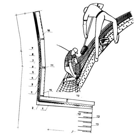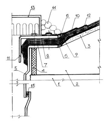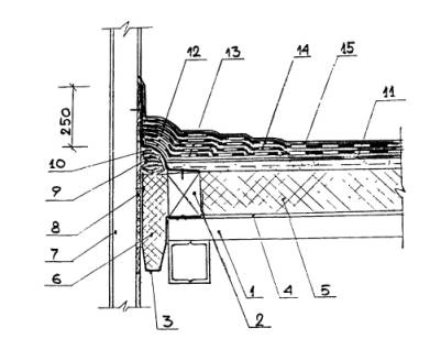 Конструктивное решение сопряжения крыши и кровли повышенной надежности со стеной: 1 - существующее металлическое перекрытие, 2 - деревянное ограждение, 3 - существующий металлический компенсатор, 4 - стеклорубероидная пароизоляция, 5 - теплоизоляция 5-160 мм, 6 - пористое уплотнение, 7 - существующая стена, 8 - пенополиуретановое уплотнение, 9 - пакля, пропитанная грунтовкой БСКМ, 10 - компенсатор из нержавеющей стали или меди, 11 - грунтовка и мастика Абрис Ру по стяжке, 12 - слои приклеивающей мастики БСКМ, 13 - дополнительные слои ткани, 14 - основная армирующая основа кровли, 15 - защитное покрытие мастики БСКМ с посыпкой (слюда, резиновая крошка, алюминиевая пудра)