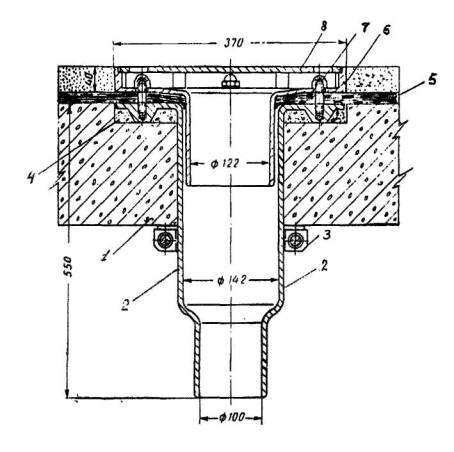 Рис. 5.8. Конструкция водосточной воронки Вр7м условным проходом патрубка 80 мм для жилых зданий: 1 - железобетонная плита, 2 - сливной патрубок, 3 - фланец, 4 - уплотнение, 5 - два слоя стеклоткани на мастике БСКМ, 6 - глухая гайка для крепления решетки, 7 - колпак, 8 - приемная решетка, 9 - патрубок из асбоцементной трубы 0У=15О мм (только для совмещенных покрытий)