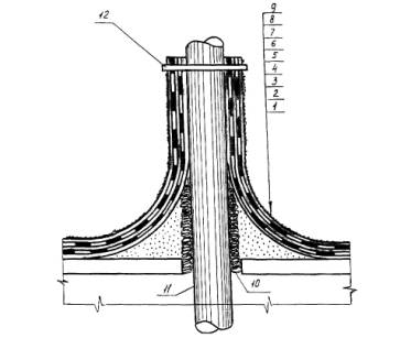 Схема оклеенной герметизации сопряжения трубы с кровлей: 1 - железобетонное перекрытие, 2 - стяжка, переходящая в выкружку, 3,4- грунтовка и мастика Абрис®Ру, 6, 8 - мастика БСКМ, 5,7- ткань или нетканка, 9 - декоративно-защитное покрытие БСКМ с алюминиевой пудрой (слюдой), 10 - пакля, пропитанная грунтовкой БСКМ, 11 - труба, 12 - скрутка