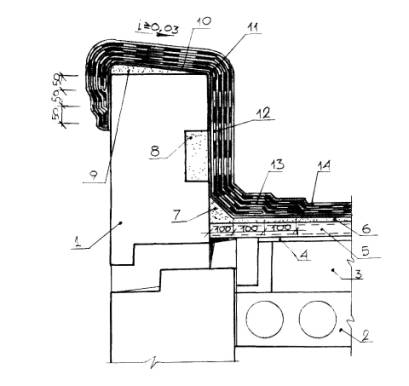 Конструктивное решение ремонта ветхого кирпичного парапета: 1 - парапет, 2 - железобетонное перекрытие, 3 - утеплитель, 4 - полиэтиленовая пленка 300 мкм, 5 - армированная цементно-песчаная стяжка, 6 - полимеррастворное выравнивающее покрытие, 7 - выкружка из полимерраствора, 8 - полимеррастворное уплотнение "выдры", 9 - полимерраствор-разуклонка, 10 - грунтовка и мастика Абрис®Ру, 11 - слои мастики БСКМ, 12 - армирующие слои нетканки, 13 - армирующие слои стеклосетки, 14 -декоративно-защитное покрытие из мастики БСКМ с посыпкой резиновой крошкой (слюдой, алюминиевой пудрой) - обработав мастикой БСКМ наклеенное полотнище, накладывают такой же второй слой стеклоткани с таким расчетом, чтобы крестообразные разрезы не совпадали; - по второму слою стеклоткани наносят слой мастики БСКМ и вдавливают прижимное кольцо так, чтобы оно не выступало над будущим кровельным покрытием; - образовавшиеся впадины уплотняют полимерраствором, а затем выполняют общее кровельное покрытие, армированное или неармированное с защитным покрытием; - одновременно с нанесением декоративно-защитного покрытия (или слюдяной посыпки) устанавливают заблаговременно окрашенный БСКМ колпак, вокруг которого укладывают крупный морозостойкий гравий. 5.13. Герметизацию примыкания к стенам машинного отделения выполняют в следующей последовательности (см. рис. 5.2, 5.3): - счищают старый кровельный "ковер" и расчищают "выдру" (при сохранившейся деревянной закладной детали ее укрепляют и покрывают БСКМ-грунтовкой); - выполняют полимеррастворную выкружку, обеспечивая плавный переход к стене; - по затвердевшему полимерраствору щеткой-шваброй наносят первый приклеивающий слой мастики Абрис®Ру, расстилая по нему армирующую основу; - на армирующую основу наносят приклеивающий слой мастики БСКМ, расстилая по нему второй слой армирующей основы таким образом, чтобы стыки полотнищ не совмещались. 5.14. В такой же последовательности выполняют герметизацию примыканий к парапетным ограждениям и стенам вентиляционных шахт и трубопроводов (рис. 5.13-5.16). Особенностью герметизации сопряжения вентиляционных труб с кровлей (рис. 5.13, 5.14) и кровельного покрытия в зоне швов (рис. 5.17, 5.18), которые рационально выполнять набивкой несмоленой пакли, пропитанной грунтовкой БСКМ. 5.15. При устройстве кровельных покрытий не крышах длиной до 20 м (площадь около 250 м2) и при наличии выступающих над крышей конструкций не требуется разрезка мастичного (армированного или неармированного) покрытия деформационными швами. 5.16. На крышах длиной более 20 м или по предлагаемому проекту обязательно выполнение деформационных швов, компенсирующих возможные деформации кровельных панелей. Очевидно, что деформационный шов кровельного покрытия нужно совмещать со швом разрезки стяжки-разуклонки (рис. 5.19-5.28). 5.17. Если при выполнении капитального ремонта в стыках кровельных панелей обнаруживается цементно-песчаный раствор, то его необходимо вычистить на глубину не менее 5 см, а образовавшуюся полость уплотнить вспененным полиэтиленом типа Вилатерм (в зависимости от ширины полости используют круглые прокладки диаметром от 30 до 80 мм). Затем стык перекрывают самоклеящейся лентой Абрис®С-ЛТбаз шириной полосы 20 см (рис. 5.24, 5.25, 5.28, 5.29). 5.18. Стяжку-разуклонку выполняют из цементно-песчаного раствора или асфальтобетона с расчетной разрезкой н
