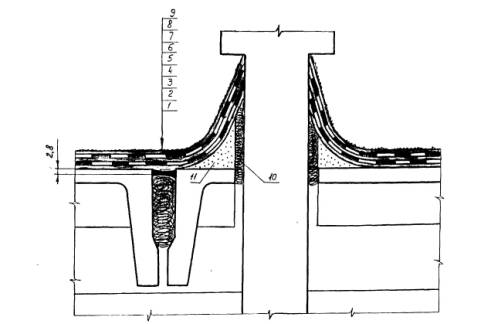 Схема герметизации кровли со стеной в зоне деформационного шва: 1 - железобетонное перекрытие, 2, 10 - пакля, пропитанная грунтовкой БСКМ, 3 - мастика Абрис®Ру, 4, 5 - грунтовка и слой мастики Абрис®Ру, 7 - мастика БСКМ, 6, 8 - армирующая основа (нетканка или тонкая стеклоткань), 9 - декоративно-защитное покрытие - мастика БСКМ, наполненная алюминиевой пудрой, 11 - полимеррастворная выкружка