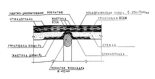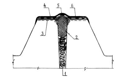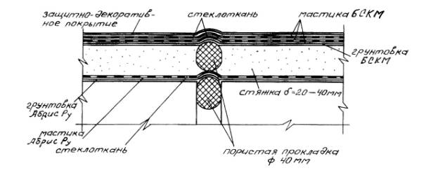 Вариант конструктивного решения деформационного шва: 1 - пакля, пропитанная грунтовкой БСКМ, 2 - прокладка типа Вилатерм, 3 - зона очистки, 4 - приклеивающая мастика Абрис®Ру, 5 – стеклоткань толщиной до 0,6 мм, 6 - защитное покрытие - мастика БСКМ с алюминиевой пудрой