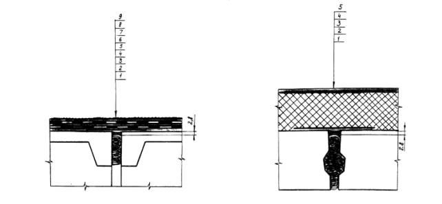 Рис. 5.23. Вариант конструктивного решения деформационного шва: 1 - железобетонное перекрытие, 2 - пакля, пропитанная грунтовкой БСКМ, 3 - зона очистки старого покрытия, 4 - мастика Абрис®Ру, 5 – толстая стеклоткань, 6 - мастика БСКМ