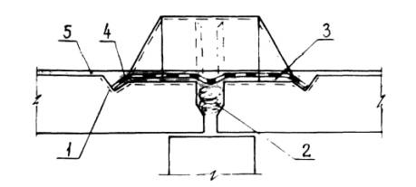 Вариант конструктивного решения герметизации деформационного шва в кровельном покрытии: 1 - зона очистки, 2 - пакля, пропитанная грунтовкой БСКМ, 3 - приклеивающая мастика Абрис®Ру, 4 - стеклоткань-рогожа, 5 - мастика БСКМ с защитной посыпкой