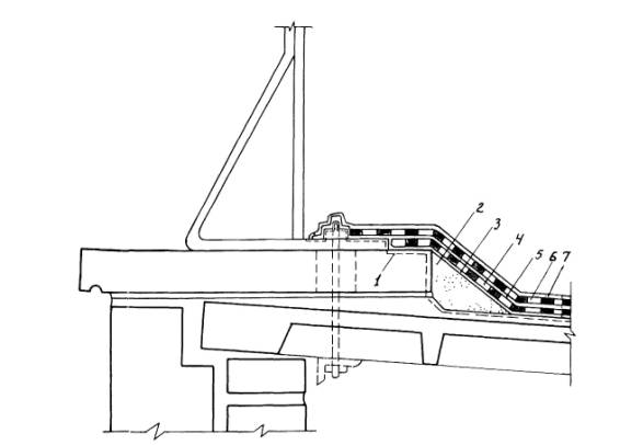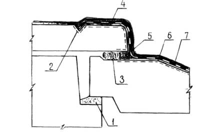 Конструктивное решение деформационного шва в водосборном лотке: 1 - старое уплотнение между железобетонными конструкциями, 2 - зона очистки, 3 - пакля, пропитанная грунтовкой БСКМ, 4 - приклеивающий слой мастики Абрис®Ру, 5 - мастика Абрис®Ру, 6 - два слоя армирующей ткани, 7 - защитное покрытие - мастика БСКМ с посыпкой