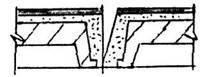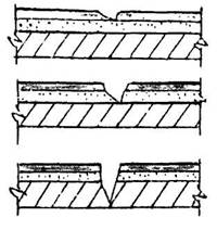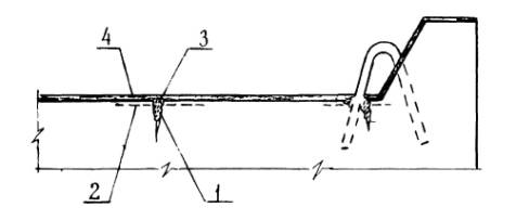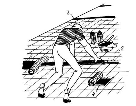 Рис. 5.27. Технологическая схема устройства деформационного шва в кровельном покрытии: 1 - прорезь в стяжке, 2 - грунтовка БСКМ, 3 - пористая прокладка типа Вилатерм, 4 - ткань-рогожа, пропитанная мастикой БСКМ