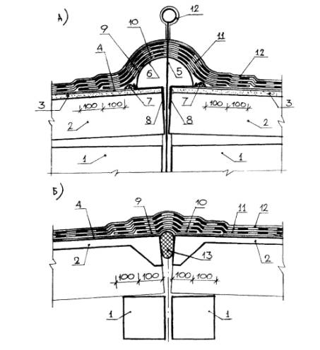Варианты герметизации деформационных швов уникальных крыш: 1 - стыкуемые железобетонные конструкции, 2 - железобетонные кровельные панели, 3 - стяжка из напрягающего цементно-песчаного раствора или полиизоцианатный полимерраствор Лукар-ОВ, 4, 9 - грунтовка и мастика Абрис®Ру, 5 - анкер для крепления растяжек, 6 -металлический компенсатор, - прокладка из пористой резины, 8 - опора компенсатора, 10, 11 - армирующа; стекло- или базальтовая ткань, 12 -декоративно-защитное покрытие - мастика БСКМ с алюминиевой пудрой, 13 - пористая прокладка типа Вилатерм