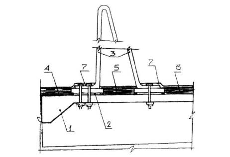 Рис. 5.31. Конструктивная схема сопряжения металлического ограждения с кровлей: 1 - железобетонное перекрытие, 2 - упругая резиновая подкладка, 3 - ограждение, 4, 5 - грунтовка и мастика Абрис®Ру, 7 - два слоя мастики БСКМ, 6 - два слоя ткани или нетканки, 7 - мастика БСКМ с алюминиевой пудрой (или посыпка слюдой)