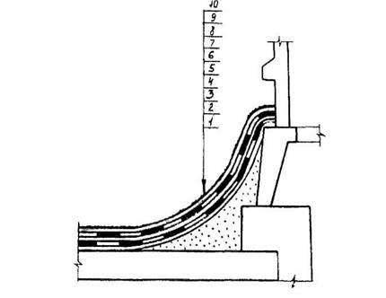 Рис. 5.32. Конструктивное решение примыкания кровли к сборным железобетонным ограждениям: 1 - железобетонная плита, 2 - стяжка, переходящая в выкружку, 3,4- грунтовка и мастика Абрис®Ру, 6, 8 - мастика БСКМ, 5,7- ткань или нетканка, 9 - защитный слой мастики БСКМ, 10 - присыпка слюдяная или резиновая крошка