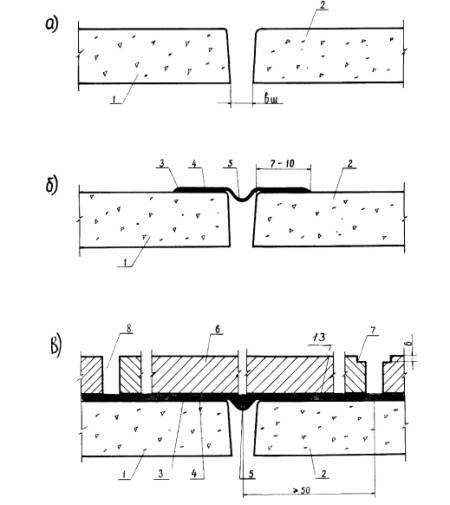 Последовательность (варианты) технологических операций по устройству деформационных швов эксплуатируемой кровли; а) - стыковое соединение кровельных панелей; б) - шов, оклеенный Абрис®С-ЛТбаз с провисом-компенсатором; в) - устройство защитного покрытия (плиты, монолитный бетон): 1,2- смежные панели, 3 - грунтовка Абрис®Ру, 4 -Абрис®С-ЛТбаз, армированная толстой стеклотканью или рогожей, 5 - компенсатор, 6 - бетон, 7 - вариант стыкового соединения с уступом, 8 - вариант стыка-прорези, 13 - мастика Абрис®Ру толщиной до 3,5 мм