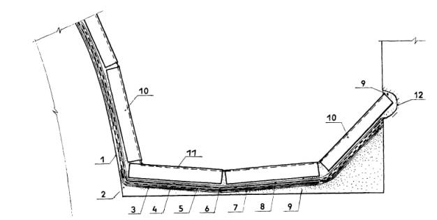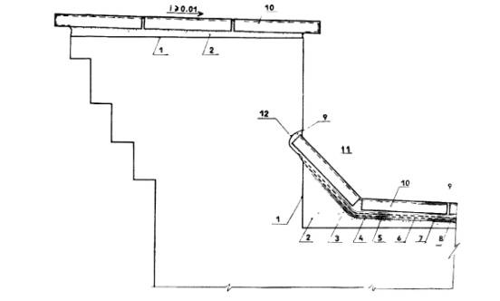 Рис. 5.37. Конструктивное решение ендовы в эксплуатируемой кровле: 1 - железобетонное перекрытие, 2 - стяжка из полимерраствора или цементно-песчаного раствора на НЦ-20 (40), 3,4- грунтовка и мастика Абрис®Ру, 5,1 - базальтовая или стеклянная ткань, 6, 8 - мастика БСКМ, 9 - полиизоцианатный полимерраствор Лукар-ОХ или утолщенный до 3,5 мм слой мастики БСКМ, 10 - плиты облицовки, 11 - пропитка, например Лукаром-ОП, 12 – штраба