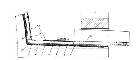 Конструктивное решение эксплуатируемой кровли с наружным водоотводом: 1 - железобетонное перекРытие, 2 - стяжка из полимерного или цементно-песчаного раствора на напрягающем цементе, 3,4- грунтовка и мастика Абрис®Ру, 5,7 - армирующая основа, 6, 8 - мастика БСКМ, 9 - утолщенный слой мастики БСКМ или полиизоцианатный полимерраствор Лукар-ОХ, 10 - облицовка, 11 - пропитка полиизоцианатная Лукар-ОП, 12 - железобетонный водомет с капельником