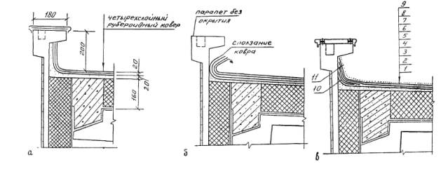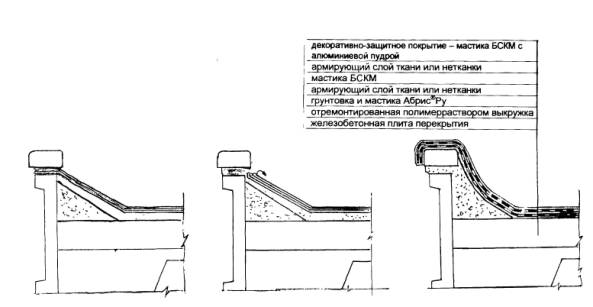 Схемы нанесения швабрами мастики розливом с разравниванием обрезиненными и мастерком 4.14. Мастику Абрис®Ру следует использовать только для первого слоя. 4.15. Мастику БСКМ следует наносить механизированным путем за 2-3 прохода толщинами слоев не более 1,0 мм. Каждый последующий слой наносят на следующий день. 5. КОНСТРУКТИВНО-ТЕХНОЛОГИЧЕСКИЕ РЕШЕНИЯ5.1. Мастичные кровли применяют на зданиях с уклонами скатов не более 12 %, как правило, с внутренними водостоками. 5.2. Кровельный мастичный слой следует выполнять толщиной до 3,0 мм. В примыканиях и сопряжениях кровли толщина слоя может достигать 4,0 мм. Общий усредненный расход мастик на кровлю составляет 4,0 кг/м2. Увеличение расхода на 0,5 кг/м возможно при шероховатой поверхности с трещинами. 5.3. В местах примыкания кровельного покрытия к вертикальным конструкциям (элементам) крыши следует выполнять наклонные (45°) бортики размером 150×150 мм или выкружки по радиусу 200 мм (рис. 5.1). Бортик делают до устройства мастичной кровли и покрывают слоем мастики БСКМ за 2-3 прохода. Над бортиком на стену наносят мастику БСКМ на высоту около 150 мм. В отдельных случаях парапеты полностью изолируют мастикой, армируя ее (рис. 5.2, 5.3). 5.4. Верхний край вертикального участка мастичной кровли, как правило, не нуждается в дополнительной защите металлическими фартуками. 5.5. В узлах примыканий и сопряжений кровли, как правило, предусматривается армирование мастичного слоя. Необходимость армирования возникает в случаях, когда возможны значительные деформации в узлах сопряжения конструкций. В таких узлах мастики армируют от 1 до 3 слоев стеклоткани, стеклосетки или нетканых материалов, с дополнительным нанесением 1 -2 поверхностных слоев мастики. 5.6. При наличии в основании кровли стыков конструкций и деформационных швов полости стыков конструкций уплотняют прокладками типа Вилатерм и герметизируют мастикой Абрис® Ру. 5.7. При необходимости защиты покрытия от УФ облучения и перегрева поверхность мастичной кровли покрывают солнцезащитным слоем. Защитный слой укладывают по верхнему слою мастики БСКМ. В качестве декоративно-защитного покрытия используют разжиженную мастику БСКМ, наполненную алюминиевой пудрой (см. п. 1.14). 5.8. При условии повышенной влажности основания (железобетонной плиты, стяжки) возникает необходимость устройства "дышащей" кровли с частичной приклейкой к основанию. В этом случае возникающая под кровлей под давлением паровоздушная смесь выводится через примыкания в наружный воздух, чем полностью исключаются вздутия даже в экстремальных ситуациях.