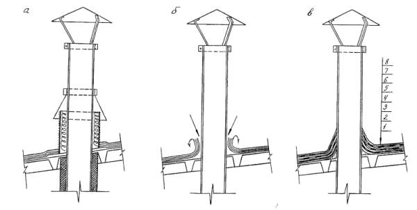 процессе эксплуатации, справа - после ремонта) Рис. 5.44. Конструктивное решение ремонта сопряжения кровли с вентиляционной трубой: а) - по проекту, б) - в процессе эксплуатации, в) - после ремонта; 1 - железобетонное покрытие, 2,3 - грунтовка и мастика Абрис ®Ру, 4 - первый слой армирующей основы - нетканка, 5 - мастика БСКМ, 6 - второй слой армирующей основы, 7 - второй слой мастики БСКМ, 8 - защитный слой мастики БСКМ с алюминиевой пудрой