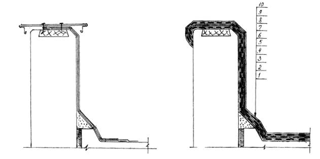 Вариант конструктивного решения ремонта гидрозащиты парапета (слева - по проекту, справа - после ремонта): 1 - железобетонное перекрытие, 2 - полимеррастворная выкружка, 3,4- грунтовка и мастика Абрис®Ру, 5,7,9 - армирующая основа, 6, 8 - мастика БСКМ, 10 - декоративно-защитное покрытие - мастика БСКМ, наполненная алюминиевой пудрой