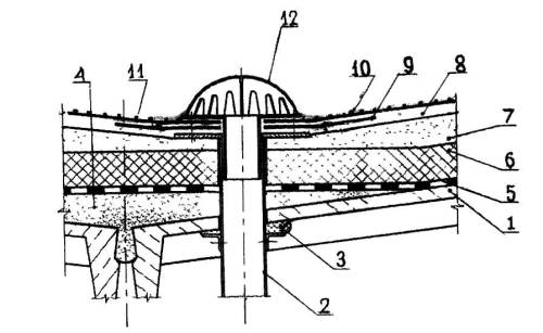 Рис. 5.48. Конструктивное решение мастичной кровли в зоне водоприемной воронки: 1 - железобетонная плита покрытия; 2 - водоприемная чаша с отверстиями в трубе 0 не более 5 мм для 3 - мастика Абрис*Ру; 4 - стяжка-разуклонка из цементно-песчаным раствора на 5 - пароизлояция мастикой БСКМ; 6 - теплоизоляция полистиролбетон (пенополиуретан, пенобетон); 7 - выравнивающая стяжка-разуклонка из цементно-песчаного раствора на напрягающем цементе НЦ-20 (40); 8 - грунтовка разжиженной мастикой БСКМ; 9 - мастика БСКМ, армированная тканью; 10 - второй слой мастики БСКМ, армированной тканью; 11 - декоративно-защитное покрытие; 12 - колпак водоприемной воронки