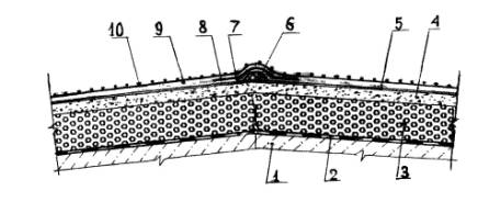 Рис. 5.49 Конструктивное решение мастичной кровли в зоне конька: 1 - железобетонная плита покрытия; 2 - пароизлояция мастикой Абрис Ру с покрытием стеклотканью; 3 - теплоизоляция полистиролбетон (пенополиуретан, 4 - выравнивающая стяжка-разуклонка из цементно-песчаного раствора на напрягающем цементе НЦ-20 (40); 5 - грунтовка разжиженной мастикой БСКМ; 6 - поропласт (Вилатерм, Гернит, ПРП и т.п.), приклеенный на мастике БСКМ; 7 - мастика БСКМ; 8 - армирующая основа - базальтовая или стеклоткань шириной около 500 мм толщиной 0,25-0,35 мм; 9 - мастики БСКМ; 10 - декоративно-защитное покрытие