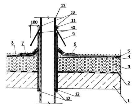 Конструктивной решение сопряжения кровли с вентиляционной трубой: 1 - железобетонная плита покрытия; 2 - пароизоляция мастикой Абрис®Ру с покрытием стеклотканью; 3 - теплоизоляция полистирол бетон (пенополиуретан, 4 - выравнивающая стяжка-разуклонка из цементно-песчаного 5 - грунтовка разжиженной мастикой БСКМ; 6 - дополнительный слой мастики БСКМ, армированный 7 - кровельное покрытие мастикой БСКМ; 8 - декоративно-защитное покрытие; 9 - зонт из оцинкованной кровельной стали толщиной 0,8 мм; 10 - мастика Абрис®Ру; 11 - хомут; 12 - патрубок с фланцем; 13 - пропускаемая труба