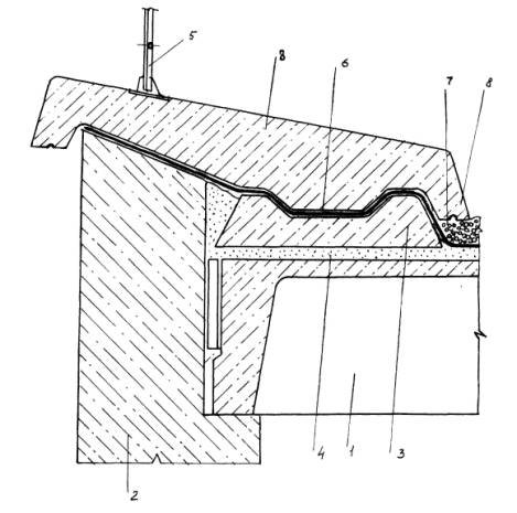 Конструктивное решение кровли из сборных железобетонных элементов: 1 - железобетонное перекрытие, 2 - железобетонная стена - парапет, 3 - железобетонный корытообразный элемент, 4 - полимерраствор или цементно-песчаный раствор на напрягающем цементе НЦ-20 (40) 5 - металлическая стойка ограждения, приваренная к закладной детали 6 - мастика Абрис*Ру, 7 - гравийный фильтр-засыпка, 8 - защитный железобетонный элемент - на следующий день нанести слой мастики БСКМ толщиной до 2,0 мм, разложив по нему утолщенную ткань-рогожу толщиной около 0,6 мм; - на следующий день нанести утолщенный слой мастики БСКМ до 3,0 мм или полимерраствор, например, полиизоцианатный Лукар-ОХ (см. Приложение 5), на который наклеить облицовку; - если облицовку выполняют из пористых материалов (бетонная плитка, специальный кирпич и т.п.), то необходимо выполнить пропитку, например, полиизоцианатным составом Лукар-ОП.