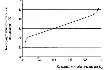 По полученным данным строятся интегральные кривые распределения температуры наиболее холодной пятидневки на сетке асимметричной частоты: по оси ординат - логарифмическая шкала температуры воздуха, по оси абсцисс - двойная логарифмическая шкала обеспеченности. С кривых снимается температура наиболее холодной пятидневки заданной обеспеченности. Пример графика зависимости температуры наиболее холодной пятидневки t5, °С, от обеспеченности приведен на рис. 2 [5].