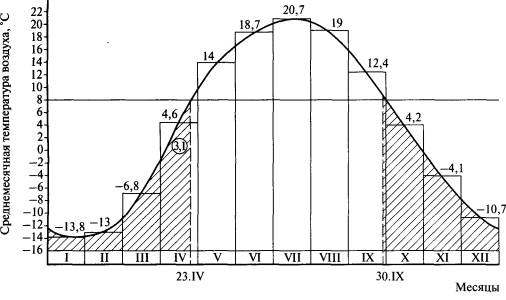 Рис. 2. Интегральная кривая температуры наиболее холодной пятидневки По заданию на проектирование допускается принимать за расчетную более низкую температуру наружного воздуха. Однако следует иметь в виду, что понижение расчетной температуры наружного воздуха (ужесточение условий) для зданий, присоединяемых к тепловой сети централизованного теплоснабжения, во избежание перетопа требует автоматизации теплоподачи в помещение. 1.3. Средняя температура и продолжительность отопительного периодаОсновными характеристиками отопительного периода являются средняя температура to.п, °С, и продолжительность zo.п, сут, этого периода. Причем они относятся к отрезку времени с устойчивыми значениями граничной температуры отопительного периода. Отдельные дни со среднесуточной температурой, равной или ниже соответственно 8 или 10 °С, не учитываются. Эти данные приведены в СНиП 23-01-99* [3]. Средняя температура to.п и продолжительность zo.п отопительного периода рассчитываются по следующей методике. Сначала строится гистограмма годового хода температуры воздуха: наносятся прямоугольники, у которых основание равно числу дней месяца, а высота - средней температуре воздуха за данный месяц. Кривая годового хода проводится так, чтобы участок, отсекаемый от каждого прямоугольника, был равен по площади участку, который эта кривая прибавляет к нему с другой стороны. Затем с графика снимаются даты устойчивого перехода среднесуточных температур воздуха через отметки 8 или 10 °С. По разнице между этими датами определяется продолжительность отопительного периода zo.п. Средняя температура отопительного периода to.п находится следующим образом. Сумма температур воздуха за полные месяцы отопительного периода вычисляется сложением произведений среднемесячной температуры воздуха соответствующего полного месяца и числа дней в этом месяце. Затем определяется сумма температур воздуха за неполные месяцы по кривой годового хода как произведение числа дней от даты начала отопительного периода до конца месяца и от начала месяца до даты конца отопительного периода и средней температуры на этих отрезках неполных месяцев. Средняя температура отопительного периода определяется делением общей суммы значений температуры отопительного периода на его продолжительность в днях. Пример определения продолжительности и средней температуры отопительного периода приведен на рис. 3. На графике над каждым прямоугольником указана среднемесячная температура воздуха. Даты начала и конца отопительного периода - 30 сентября и 23 апреля. Продолжительность отопительного периода zo.п = 1(сентябрь) + 31(октябрь) + 30(ноябрь) + 31(декабрь) + 31(январь) + 28(февраль) + 31(март) + 23(апрель) = 206 сут. Сумма температур за полные месяцы отопительного периода: 4,2·31 + (-4,1·30) + (-10,7·31) + (-13,8·31) + (-13·28) + (-6,8·31) = -1327,1 °С. Сумма температур за неполные месяцы отопительного периода: 8·1 + 3,1·23 = 79,3 °С.