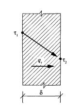 где δ - толщина стенки, м; τ1, τ2 - значение температуры соответственно на поверхностях стенки 1 и 2, °С. Из формулы (3.2) следует, что распределение температуры по толщине стенки - линейное. Термическое сопротивление материального слоя Rт, м2·°С/Вт, определяется по формуле Следовательно,