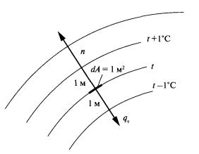 Рис. 5. К определению коэффициента теплопроводности материала: п - нормаль к поверхности Большинство строительных материалов - пористые тела. Зависимость коэффициента теплопроводности строительных материалов от их плотности обусловлена тем, что практически любой строительный материал состоит из скелета - основного строительного вещества - и воздуха. К.Ф. Фокин [13] для примера приводит такие данные: коэффициент теплопроводности абсолютно плотного вещества (без пор) в зависимости от природы имеет теплопроводность от 0,1 Вт/(м·°С) (пластмасса) до 14 Вт/(м·°С) (кристаллические вещества при потоке теплоты вдоль кристаллической поверхности), в то время как теплопроводность воздуха около 0,026 Вт/(м·°С). Чем выше плотность материала (меньше пористость), тем больше значение коэффициента теплопроводности. Понятно, что легкие теплоизоляционные материалы имеют сравнительно небольшую плотность. Коэффициент теплопроводности увеличивается с повышением влажности материала. Влажность характеризуется наличием в материале химически несвязанной воды. Весовая влажность ωв, %, определяется отношением массы влаги, содержащейся в образце материала, к его массе в сухом состоянии:
