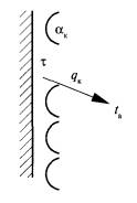 Конвекция имеет место на наружной и внутренней поверхностях ограждений здания. В теплообмене внутренних поверхностей помещения конвекция играет существенную роль. При различных значениях температуры поверхности и прилегающего к ней воздуха происходит переход теплоты в сторону меньшей температуры. Тепловой поток, передаваемый конвекцией, зависит от режима движения жидкости или газа, омывающих поверхность; температуры, плотности и вязкости движущейся среды; шероховатости поверхности; разности между температурами поверхности и омывающей ее среды. Процесс теплообмена между поверхностью и газом (или жидкостью) протекает различно в зависимости от природы возникновения движения газа. Выделяют естественную и вынужденную конвекцию. В первом случае движение газа происходит за счет разности температур поверхности и газа, во втором - за счет влияния внешних сил (работы вентиляторов, ветра). Вынужденная конвекция в общем случае может сопровождаться и естественной конвекцией, но из-за того что интенсивность вынужденного процесса заметно больше, то при его рассмотрении естественной конвекцией часто пренебрегают. В дальнейшем будут рассмотрены только стационарные процессы конвективного теплообмена, предполагающие постоянство во времени скорости и температуры в любой точке воздуха. Однако поскольку температура элементов помещения изменяется довольно медленно, полученные для стационарных условий зависимости могут быть распространены и на процесс нестационарного теплового режима помещения, при котором в каждый рассматриваемый момент процесс конвективного теплообмена на внутренних поверхностях ограждений считается стационарным. Полученные для стационарных условий зависимости могут быть распространены и на случай внезапной смены природы конвекции от естественной к вынужденной, например, при включении рециркуляционного аппарата для нагрева помещения (фэнкойла или сплит-системы в режиме теплового насоса). Во-первых, новый режим движения воздуха устанавливается быстро. Во-вторых, требуемая точность инженерной оценки процесса теплообмена ниже возможных неточностей от отсутствия коррекции теплового потока в течение переходного состояния. В практических расчетах конвективного теплового потока qк, Вт, передаваемого конвекцией от движущейся среды к поверхности или наоборот (рис. 6), применяют уравнение Ньютона qк = αк(ta - τ), (3.8) где αк - коэффициент конвективного теплообмена (теплоотдачи конвекцией) на поверхности стенки, Вт/(м2·°С); ta - температура воздуха, омывающего поверхность стенки, °С; τ - температура поверхности стенки, °С. 3.2.2. Движение воздуха у внутренней поверхности огражденияВ обычных условиях на внутренней поверхности ограждения наблюдается естественная конвекция. В таком процессе выделяют хорошо изученный идеальный случай свободной конвекции, когда практически неограниченная по длине поверхность находится в большом объеме воздуха. Температура поверхности постоянна по длине и ширине. Воздух вдали от поверхности неподвижен, и его температура одинакова. Если температура стенки будет выше температуры воздуха, это вызовет нагрев прилегающего к поверхности воздуха и подъем его вверх за счет вытеснения снизу более холодным воздухом. При охлаждении теплообмен аналогичен процессу нагрева воздуха, но про