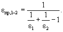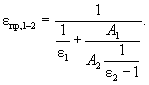 Рис. 10. Структура лучистых потоков на поверхности серого тела: qпогл - поглощенный лучистый поток, Вт/м2; qпад - падающий лучистый поток, Вт/м2; qотр - отраженный лучистый поток, Вт/м2; q - собственное излучение поверхности, Вт/м2; qэфф - эффективное излучение поверхности, Вт/м2 3.3.2. Приведенный коэффициент излученияДля учета взаимодействия двух серых поверхностей со своими коэффициентами излучения e1 и e2 в расчет вводится приведенный коэффициент излучения eпр,1-2, который может быть рассчитан для трех идеальных случаев. 1. Если поверхности малы или расстояние между ними велико настолько, что отраженная часть излучения, возвращающаяся на излучающую поверхность, становится пренебрежимо малой, то eпр,1-2 = e1e2 (3.26) 2. Если расстояние между двумя параллельными поверхностями по сравнению с их размерами мало настолько, что вся излучаемая ими теплота попадает друг на друга и вся отраженная от соседней поверхности возвращается на излучающую до полного ее поглощения, то 3. Если одна поверхность площадью А1, м2, окружена со всех сторон другой поверхностью площадью А2, м2, как, например, сфера в сфере, цилиндр в цилиндре, то