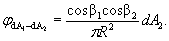 Рис. 11. Приведенные коэффициенты излучения: При произвольном расположении поверхностей в помещении точный расчет eпр,1-2 труден. Реальные значения приведенного коэффициента излучения двух поверхностей лежат между величинами, полученными по формулам (3.26) и (3.28), которые показаны на рис. 11. Для высоких значений коэффициентов излучения поверхностей e1 и e2 в помещении эти величины мало отличаются друг от друга, и поэтому eпр,1-2 можно считать по формуле (3.27), которая приводит к среднему между крайними значениями результату. 3.3.3. Коэффициент облученностиТепловая энергия излучается поверхностью во всех направлениях. По закону Ламберта распределение этой энергии по направлениям излучения пропорционально косинусу угла между направлением излучения и перпендикуляром к излучающей поверхности. Важно и то, что при лучистом теплообмене двух поверхностей не вся теплота, излучаемая поверхностью 1, падает на поверхность 2. Чтобы определить долю тепловой энергии, падающей с поверхности 1 на поверхность 2, выделим на поверхностях 1 и 2 элементарные площадки dА1 и dА2 (рис. 12). Будем считать, что отрезок прямой, соединяющей центры площадок, является линией, по которой излучение взаимно направлено с площадок друг на друга. Расстояние R, м, между площадками равно отрезку прямой между их центрами. Восстановим из центров площадок перпендикуляры к ним и получим углы b1 и b2 между перпендикулярами и соединяющей площадки прямой. С учетом закона распределения энергии доля теплоты jdА1-dА2 падающая на элементарную площадку dА2 с площадки dА1: