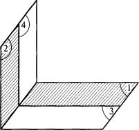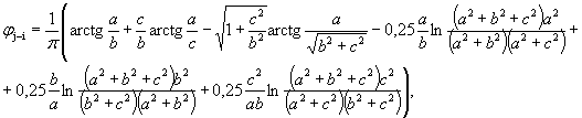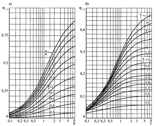 Расположение двух прямоугольных поверхностей и обозначения представлены на рис. 15. При двух одинаковых поверхностях в параллельных плоскостях, расположенных друг против друга, где a, b - стороны прямоугольников, м; n - расстояние между ними, м; при этом х = b/n, у = а/n, z = 1 + х2, w = 1 + у2. Для поверхностей в перпендикулярных плоскостях с общей гранью где p - отношение длины окружности к диаметру; p = 3,14159265; а - общая грань, м; b, с - сторона соответственно 1-го и 2-го прямоугольника, м.