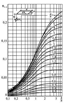 Рис. 16. Коэффициент облученности с поверхности на поверхность: Кривые изменений коэффициентов облученности при расположении поверхностей в параллельных и перпендикулярных плоскостях относительно друг друга представлены на рис. 16а, 16б. Формулы (3.36) и (3.37) считаются базовыми и вместе с геометрическими законами излучения позволяют определять коэффициент облученности для различных схем расположения поверхностей в помещении. Наиболее важные для расчета температурного режима в помещении варианты расположения поверхностей относительно друг друга и формулы расчета коэффициентов облученности с одной на другую приведены ниже. При этом площади поверхностей обозначены буквой А с индексом, соответствующим номеру поверхности. Коэффициент облученности j1-2 для схемы № 1 (рис. 17):
