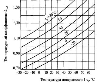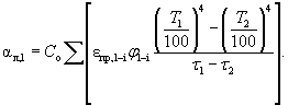 Рис. 23. Зависимость температурного коэффициента b от температуры t1 и t2 теплообменивающихся поверхностей Значения температурного множителя в практически значимом для расчета теплопотерь здания диапазоне температур приведены на рис. 23. Для условий помещения, где значения температуры поверхностей сравнительно мало отличаются друг от друга, при вычислениях температурного множителя можно использовать эмпирическую формулу, предложенную В.Н. Богословским [21]: b1-2 = 0,81 + (t1 + t2)×0,005. (3.47) После введения температурного множителя лучистый поток от поверхности 1 к поверхности 2 примет вид Q1-2 = Coeпр,1-2b1-2φ1-2 A1(t1 - t2). (3.48) 3.3.5. Радиационная температура окружающих поверхностейПри расчете теплопотерь наибольший интерес вызывает лучистый поток на наружное ограждение со всех окружающих поверхностей. Если в помещении насчитывается I поверхностей, то лучистый тепловой поток, уходящий с внутренней поверхности наружного ограждения 1 в сторону окружающих ее поверхностей, Q1, Вт, определяется по формуле Q1 = Co Σeпр,1-2φ1-2b1-2 A1(t1 - ti), (i = 2, 3,..., I). (3.49) Принято считать, что приведенные коэффициенты излучения для всех пар поверхностей в помещении одинаковы и приблизительно равны eпр = 0,93·0,93 = 0,865. Температурные множители для всех пар поверхностей также практически одинаковы. Тогда при раскрытии скобок, получается Q1 = CoeпрbA1t1 Σφ1-i - CoeпрbA1Σtiφ1-i. (3.50) По закону замкнутости лучистых потоков Σφ1-i = 1. Величину Σtiφ1-i принято называть радиационной температурой trl, °С, относительно поверхности 1: trl = Σtiφ1-i (3.51) Радиационная температура является усредненной температурой поверхностей, окружающих поверхность 1 (по признаку эквивалентности лучистого теплообмена поверхности 1 со всеми окружающими). При усреднении температура каждой поверхности берется в доле, равной коэффициенту облученности с поверхности 1 на эту поверхность, что отвечает физическому смыслу коэффициента φ1-i. (Зачастую для упрощения расчетов радиационная температура определяется при усреднении температуры окружающих поверхностей по их площади, как это показано в п. 2.1.) Теперь формула (3.49) может быть переписана в более компактном виде: Q1 = CoeпрbA1(t1 - trl). (3.52) 3.3.6. Коэффициент лучистого теплообменаВ практике расчетов теплового потока при лучистом теплообмене используют упрощенную формулу. Интенсивность передачи теплоты излучением qл, Вт/м2, определяется разностью температур поверхностей, участвующих в лучистом теплообмене: qл = αл(t1 - t2), (3.53) где t1 и t2 - температура поверхностей, обменивающихся лучистой теплотой, °С; αл - коэффициент лучистого теплообмена на поверхности стенки, Вт/(м2·°С). Как следует из формулы (3.48), коэффициент лучистого теплообмена между двумя поверхностями αл,1-2, Вт/(м2·°С), определяется по формуле αл,1-2 = Cob1-2eпр,1-2φ1-2 (3.54) Коэффициент лучистого теплообмена равен плотности теплового потока, передаваемого излучением от поверхности 1 к поверхности 2 при разности температур поверхностей в 1 °С. Если в расчет не вводить описанных выше допущений, то более полно коэффициент лучистого теплообмена может быть записан исходя из формулы (3.45): Каждая поверхность в помещении обменивается лучистой теплотой со всеми окружающими ее поверхностями. Коэффициент лучистого теплообмена между одной поверхностью 1 и окружающими поверхностями i αл,1, Вт/(м2·°С), принято относить к этой одной, поэтому для любой поверхности, обращенн