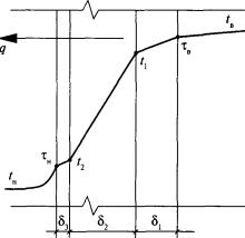 Рис. 24. Распределение температуры при теплопередаче через многослойную стенку Если с одной стороны многослойной стенки, состоящей из п слоев, поддерживается температура tв, а с другой стороны tн < tв, то возникает тепловой поток q, Вт/м2 (рис. 24). Этот тепловой поток движется от среды с температурой tв к среде с температурой tн, проходя последовательно от внутренней среды к внутренней поверхности с температурой τв: