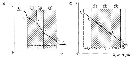 затем от внутренней поверхности сквозь 1-й слой с термическим сопротивлением R1 м2·°С/Вт, к стыку 1-го и 2-го слоев: