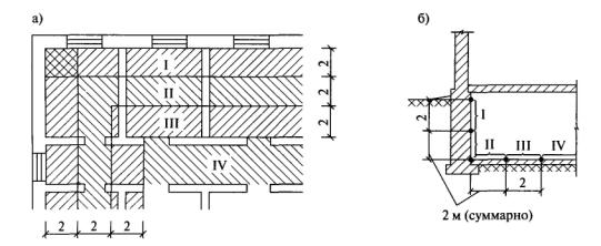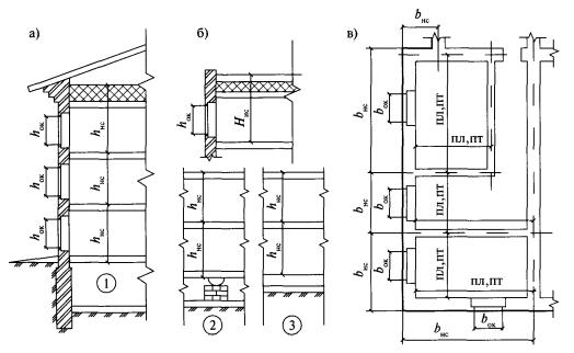 По расчетам воздушного режима 17-этажного жилого здания норма плотности для входных дверей в квартиры (табл. 23) в нем выполняется в том случае, когда Rинф ³ 0,65 м2·ч/кг (при Dр0 = 10 Па). Обычно считается, что для входных дверей в здание Rинф = 0,14...0,16 м2·ч/кг (при Dр0 = 10 Па), а для одинарных балконных дверей-переходов в незадымляемых лестничных клетках и холлах лестнично-лифтовых узлов Rинф = 0,47 м2·ч/кг (при Dр0 = 10 Па) [32]. Глава 7. Теплопотери здания7.1. Расчетные трансмиссионные теплопотериТеплопотери за счет теплопередачи (трансмиссионные теплопотери) Qoгp, Вт, по СНиП 2.04.05-91* [34] и [37, 38] рассчитываются через каждое теплотеряющее ограждение (или его часть) отдельно по формуле Qoгp = KA(tв - tн)n(1+Sb), (7.1) где К определяется из теплотехнического расчета по формуле (3.65); n определяется по табл. 16; b - коэффициент, учитывающий добавочные теплопотери. Трансмиссионные теплопотери каждого помещения рассчитываются суммированием потерь теплоты через каждое теплотеряющее ограждение, определенных по формуле (7.1). Полученную сумму округляют до 5 Вт. При расчете теплопотерь ограждающие конструкции измеряются по наружному обмеру. Этот способ обмера используется в связи с тем, что, во-первых, неодномерная теплопередача через наружные ограждения осуществляется через всю толщу наружных ограждений; во-вторых, наружный обмер приводит к некоторому (очень небольшому) запасу мощности системы отопления, тогда как внутренний обмер дает несколько заниженный результат, что в реальном проектировании совершенно неприемлемо. При подсчете потерь теплоты по формуле (7.1) площадь отдельных ограждений А, м2, определяется с соблюдением следующих правил обмера: 1. Площадь окон (ок), дверей (нд) и фонарей (ф) измеряют по наименьшему строительному проему. 2. Площадь потолка (пт) и пола (пл) измеряют между осями внутренних стен и внутренней поверхностью наружной стены (рис. 34). Площадь стен и пола, расположенных на грунте, в том числе на лагах, определяют с условной разбивкой их по зонам, как это было описано в п. 5.3 при определении сопротивлений теплопередаче этих конструкций (рис. 29). 3. Площадь наружных стен (нс) измеряют (рис. 34): • в плане - по наружному периметру между осями внутренних стен и наружным углом стены; • по высоте - на всех этажах, кроме нижнего: от уровня чистого пола до пола следующего этажа. На последнем этаже верх наружной стены совпадает с верхом покрытия или чердачного перекрытия. На нижнем этаже в зависимости от конструкции пола: а) от внутренней поверхности пола по грунту; б) от поверхности подготовки под конструкцию пола на лагах; в) от нижней грани перекрытия над неотапливаемым подпольем или подвалом. 4. При определении теплопотерь через внутренние стены их площади обмеряют по внутреннему периметру. Потери теплоты через внутренние ограждения помещений можно не учитывать, если разность температур воздуха в этих помещениях составляет 3 °С и менее.