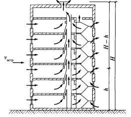 Примечание. В таблице использованы следующие общепринятые сокращения: нс - наружная стена; то - тройное окно; нд - наружная дверь; пт - потолок; пл - пол; плI - пол в расчетной зоне I; плII - пол в расчетной зоне II; плIII - пол в расчетной зоне III; плIV - пол в расчетной зоне IV; вс1 - внутренняя стена подвала; вс2 - внутренняя стена чердака; вд - внутренняя дверь из лестничной клетки на чердак. 2. Значение коэффициента положения пола первого этажа над неотапливаемым подвалом n принято по табл. 16 для подвала, не имеющего окон. 3. Добавки к основным теплопотерям определены: • для вертикального наружного ограждения на ориентацию по сторонам света (при указанной в графе 4 ориентации) по п. 7.2; • для вертикального наружного ограждения углового помещения по п. 7.2; • для входной двери в здание на врывание наружного воздуха по п. 7.2 (при двойных дверях с тамбуром между ними b = 0,27·37,4 = 10,1). 4. Неутепленный пол по грунту на лестничной клетке рассчитан по зонам. Сопротивление теплопередаче каждой расчетной зоны определено по п. 5.3. Коэффициенты теплопередачи: • для зоны I • для зоны II • для зоны III • для зоны IV 5. Теплопотери входной двери в здание рассчитываются отдельно от наружной стены, т.к. надбавка на врывание наружного воздуха в здание относится только к теплопотерям двери, поэтому ее площадь вычитается из площади наружной стены. 7.4. Потребность в теплоте на нагревание инфильтрационного воздухаРасход наружного воздуха, поступающего в помещения в результате инфильтрации в расчетных условиях, зависит от объемно-планировочного решения здания, а также плотности окон, балконных дверей, витражей. Задача инженерного расчета сводится к определению расхода инфильтрационного воздуха Gинф, кг/ч, через отдельные ограждения каждого помещения. Инфильтрация через стены и покрытия невелика, поэтому ею обычно пренебрегают и рассчитывают только через заполнение световых проемов, а также через закрытые двери и ворота, в том числе и те, которые при обычном эксплуатационном режиме не открываются. Затраты теплоты на врывание воздуха через открывающиеся двери и ворота в расчетном режиме учитываются добавками к основным теплопотерям через входные двери и ворота. Расчет выявляет максимально возможную инфильтрацию, поэтому считается, что каждое окно или дверь находится на наветренной стороне здания. Расчетная разность давлений Dр для окна или двери каждого этажа определяется по формуле (6.8) при расчетных параметрах наружного и внутреннего воздуха: температурах tн и tв, плотностях rн и rв, скорости ветра v. Внутреннее давление рв в таких расчетах обычно приближенно принимается по формуле (6.6). Тогда разность давлений по разные стороны воздухопроницаемого элемента здания принимает вид где h - расстояние от земли до центра рассматриваемого воздухопроницаемого элемента в здании (окна, балконной двери, входной двери в здание, ворот, витража), м. Из формулы (7.2) видно, что при определенных соотношениях значений каждого слагаемого формулы на верхних этажах может сформироваться отрицательная разность давлений Dр = рн - рв, что означает невозможность инфильтрации. Расход инфильтрационного воздуха Go, кг/(м2·ч), при этом составит: • через окна • через двери и ворота