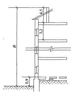 Рис. 36. План и разрез здания к примеру расчета теплопотерь: а - фрагмент плана типового этажа; б - разрез 1 - 1 Высота наружной стены лестничной клетки от земли до верха покрытия (уровень земли ниже пола первого этажа на 0,9 м) принята равной Ннс = 0,9 + 10·3,2 = 32,9 м. Высота здания от земли до верха вентиляционной шахты при ее высоте над полом чердака, равной 4,5 и, Н = 32,9 + 4,5 = 37,4 м. От неотапливаемого техподполья лестничная клетка отделена тремя внутренними стенами вc1 высотой 0,9 м с дверью общей площадью Авс1 = 3,2·0,9 + 2·6,2·0,9 = 14,04 м2. От холодного чердака лестничная клетка отделена тремя внутренними стенами вс2 с дверью общей площадью Авс2 = 3,2·3,5 + 6,2·2·(0,5 + 3/2) = 36,0 м2. Расчетная наружная температура tн = -28 °С, согласно п. 1.7, берется равной средней температуре наиболее холодной пятидневки (с обеспеченностью 0,92). Расчетная температура внутреннего воздуха tв = 20 °С принимается по п. 2.6. Фактическое приведенное сопротивление теплопередаче наружных ограждений принято по расчетам в соответствии с пп. 5.1-5.3. Тогда коэффициенты теплопередачи: • для наружных стен • для внутренних стен