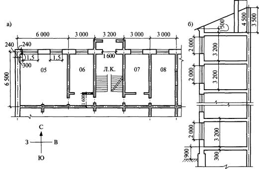 Рис. 35. Величины добавок к основным теплопотерям в зависимости от ориентации ограждения по сторонам света 2. Добавка b = 0,05 вводится для необогреваемого пола первого этажа над холодным подпольем здания в местности с расчетной температурой наружного воздуха -40 °С и ниже. 3. Добавка на угловое помещение, имеющее две и более наружных стен, учитывает, что в таком помещении радиационная температура ниже, чем в рядовом. Поэтому в угловом помещении жилого дома температуру внутреннего воздуха принимают на 2 °С выше, чем в рядовом помещении, а в зданиях другого назначения увеличенные теплопотери учитывают добавкой b = 0,05 к основным теплопотерям вертикальных наружных ограждений. 4. Добавка на врывание холодного воздуха через наружные двери в здание, не оборудованное воздушно-тепловой завесой, при их кратковременном открывании принимается к основным теплопотерям дверей. Так, в здании высотой Н для тройных дверей с двумя тамбурами b = 0,20Н, для двойных дверей с тамбуром b = 0,27Н, для двойных дверей без тамбура b = 0,34Н, для одинарных дверей b = 0,22Н. Для наружных ворот при отсутствии тамбура и воздушно-тепловой завесы теплопотери рассчитываются с добавкой b = 3, а при наличии тамбура у ворот - с добавкой b = 1. Указанные добавки не относятся к летним и запасным наружным дверям и воротам. 5. Ранее нормами предусматривалась добавка, учитывающая увеличение теплопотерь в верхней части помещения высотой более 4 м, равная b = 0,02 на каждый метр высоты стены сверх 4 м, но не более b = 0,15. Позднее это требование было исключено из норм. Теперь при расчете высоких помещений необходимо делать специальный расчет распределения температуры по высоте для определения теплопотерь через стены и покрытия. В лестничных клетках изменение температуры по высоте не учитывается. Теплопотери через наружные ограждения за счет теплопередачи принято отображать в виде таблицы, аналогичной представленной в п. 7.3. 7.3. Пример расчета трансмиссионных теплопотерь помещенийТребуется определить трансмиссионные теплопотери шести помещений административного здания: углового (1005) и рядового (1008) на верхнем этаже, углового (305) и рядового (308) на промежуточных этажах, углового (105) и рядового (108) на первом этаже, - а также рассчитать теплопотери лестничной клетки. Здание расположено в Москве. Фрагмент плана типового этажа и разрез здания приведены на рис. 36. Пол первого этажа располагается над неотапливаемым подпольем, пол лестничной клетки не утеплен по грунту.