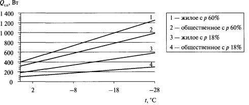 Несмотря на то что усреднение теплопотерь и теплопоступлений за месяц не отражает условий регулирования теплоотдачи отопительных приборов, даже при таком расчете просматривается необходимость введения уменьшающих коэффициентов на сумму теплопоступлений при определении сезонного теплопотребления. Для уточнения было решено проверить соотношение теплопотерь и теплопоступлений в какие-либо отдельные солнечные сутки отопительного периода и решить вопрос о том, в какие месяцы отопительного периода возможно превышение теплопоступлений над теплопотерями. Для этой части работы были использованы данные о суточном ходе прямой и рассеянной солнечной радиации в различные месяцы на географической широте Москвы - 56° с.ш. [43]. Для расчета были приняты рядовые помещения жилого и офисного здания. Теплотеряющими в помещениях являются только два ограждения: наружная стена и окно. Площадь стены с окном - 9 м2. Окно принималось разных размеров, так что доля остекления фасада возрастала от 0,18 до 0,6. Доля остекления варьировалась, т.к., с одной стороны, увеличение площади окна способствует прониканию солнечного тепла, а с другой - увеличивает теплопотери помещения. В соответствии со СНиП 23-02-2003 [1] и МГСН 2.01-99* [12] в офисном здании сопротивление теплопередаче стены принималось равным 2,68 м2·°С/Вт, в жилом - 3,13 м2·°С/Вт. Сопротивление теплопередаче окна считалось равным 0,56 м2·°С/Вт. Температура внутреннего воздуха - 20 °С. Расчет был выполнен для января, февраля, марта, апреля. В теплопотерях жилой комнаты учитывался нагрев вентиляционной нормы воздуха в размере 3 м3/ч на 1 м2 пола и бытовые теплопоступления 10 Вт/м2. Для офисного помещения принималась инфильтрация в размере 10 % от трансмиссионных теплопотерь. При этом учитывалось затенение светового проема непрозрачными элементами двухкамерного стеклопакета в пластиковых переплетах (t = 0,8), относительное пропускание солнечной радиации тройным остеклением (k = 0,74), коэффициент снижения теплопоступлений за счет тепловой инерции ограждающих конструкций (v = 0,8), коэффициент эффективности автоматического регулирования подачи теплоты системой отопления (x = 0,9). Значения теплопотерь жилого и офисного зданий в зависимости от температуры наружного воздуха при разной степени остекления фасада показаны на рис. 41. Значения теплопоступлений от солнечной радиации в солнечный день января, февраля, марта и апреля при остеклении фасада 60 % приведены на рис. 42, а на рис. 43 - при остеклении фасада 18 %.