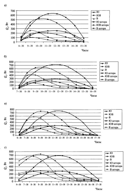 Рис. 42. Теплопоступления от солнечной радиации Qc в солнечный день января (а), февраля (б), марта (в) и апреля (г) при остеклении фасада 60 %