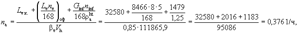 Lv - расход вентиляционного воздуха, м3/ч; n - коэффициент положения отдельного ограждения относительно наружного воздуха, уменьшающий разность температур для ограждения, не соприкасающегося с наружным воздухом; пinf - количество часов поступления инфильтрационного воздуха в неделю; пv - количество часов работы системы вентиляции в неделю; Qh - общие теплопотери здания за отопительный период, МДж или кВт×ч;